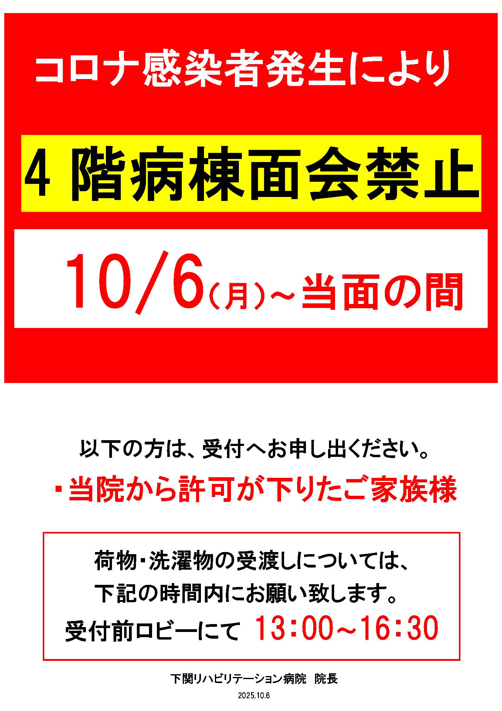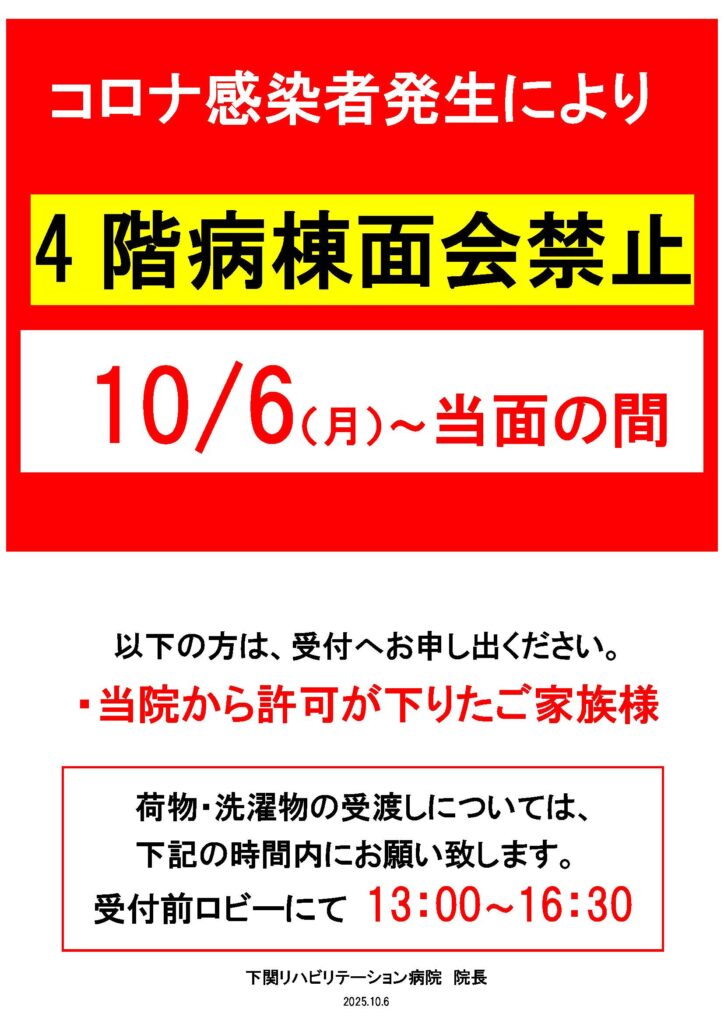 コロナウィルス感染流行のため、10月6日(月)より、当面の間4階病棟のみ面会を禁止させていただきます。