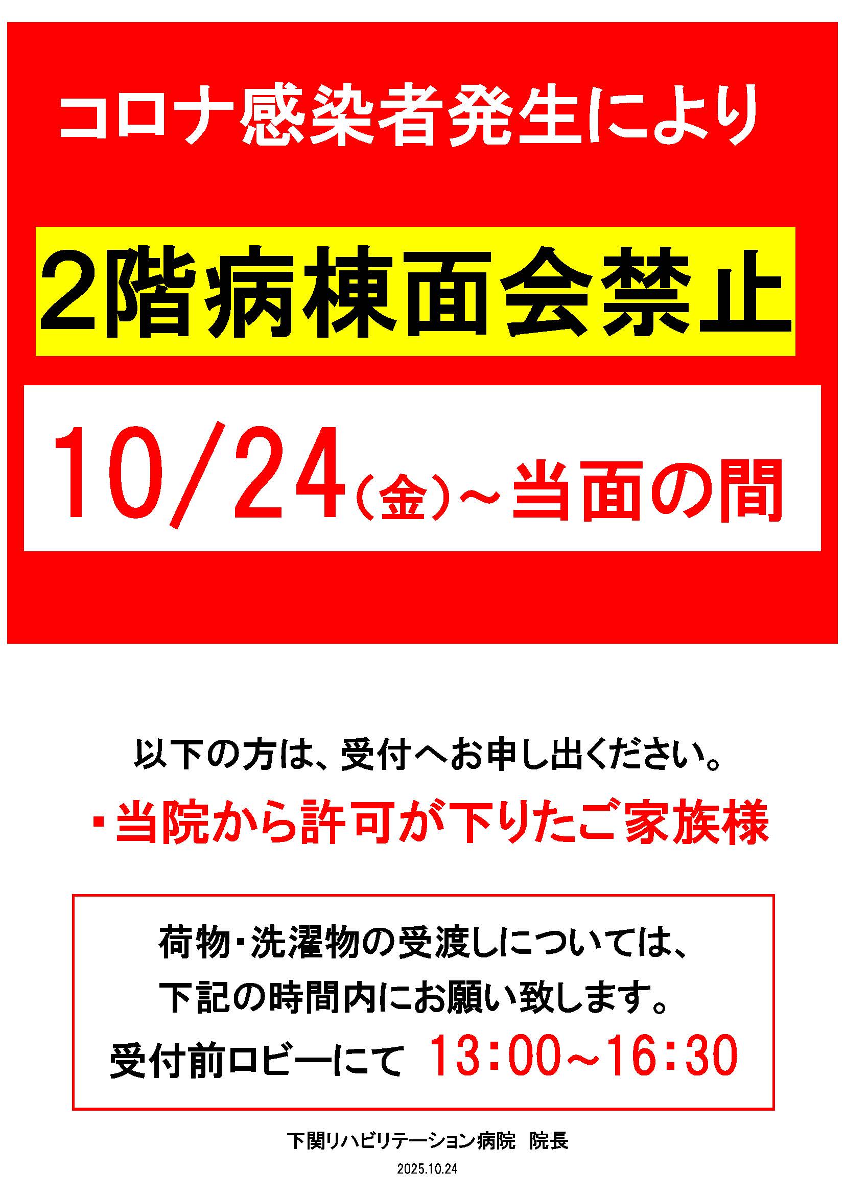 コロナウィルス感染流行のため、10月24日(金)より、当面の間2階病棟のみ面会を禁止させていただきます。