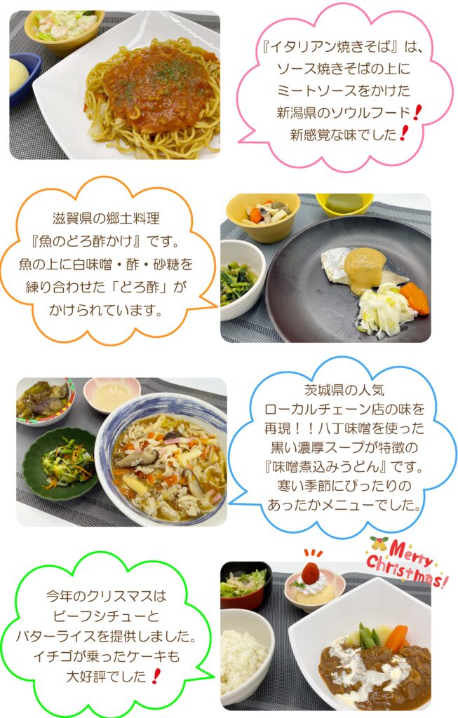 12月のイベント食は、イタリアン焼きそば、魚のどろ酢かけ、味噌煮込みうどん、クリスマスメニューでした。