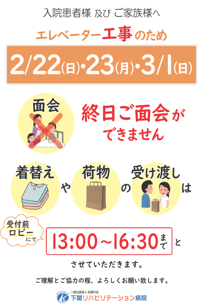 このたび、増築工事に伴う院内エレベーター工事を実施いたします。工事当日はエレベーターが終日停止となり、病棟への移動手段の確保ができないため、下記日程は面会を終日禁止とさせていただきます。