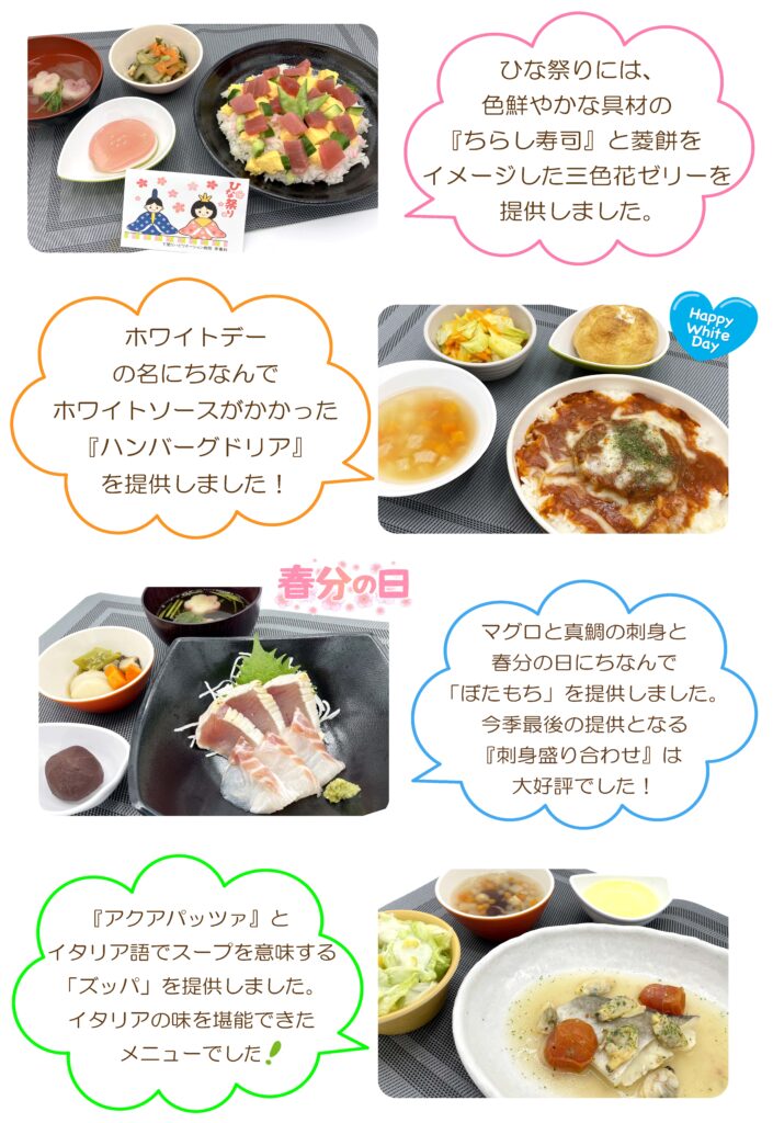 3月のイベント食は、ちらし寿司、ハンバーグドリア、刺身盛り合わせ、アクアパッツァでした。